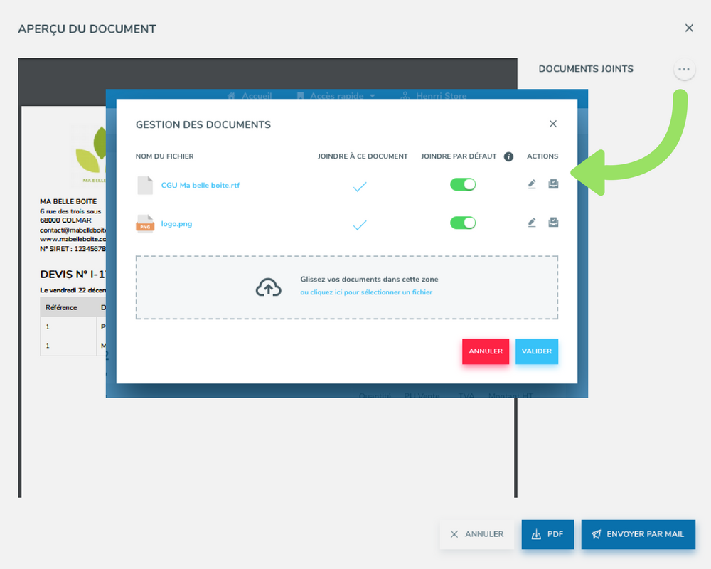Avec Henrri, ajoutez aisément une ou plusieurs pièces jointes lors de vos envois d'emails. Henrri s'occupe lui-même d'envoyer vos devis, factures, etc.