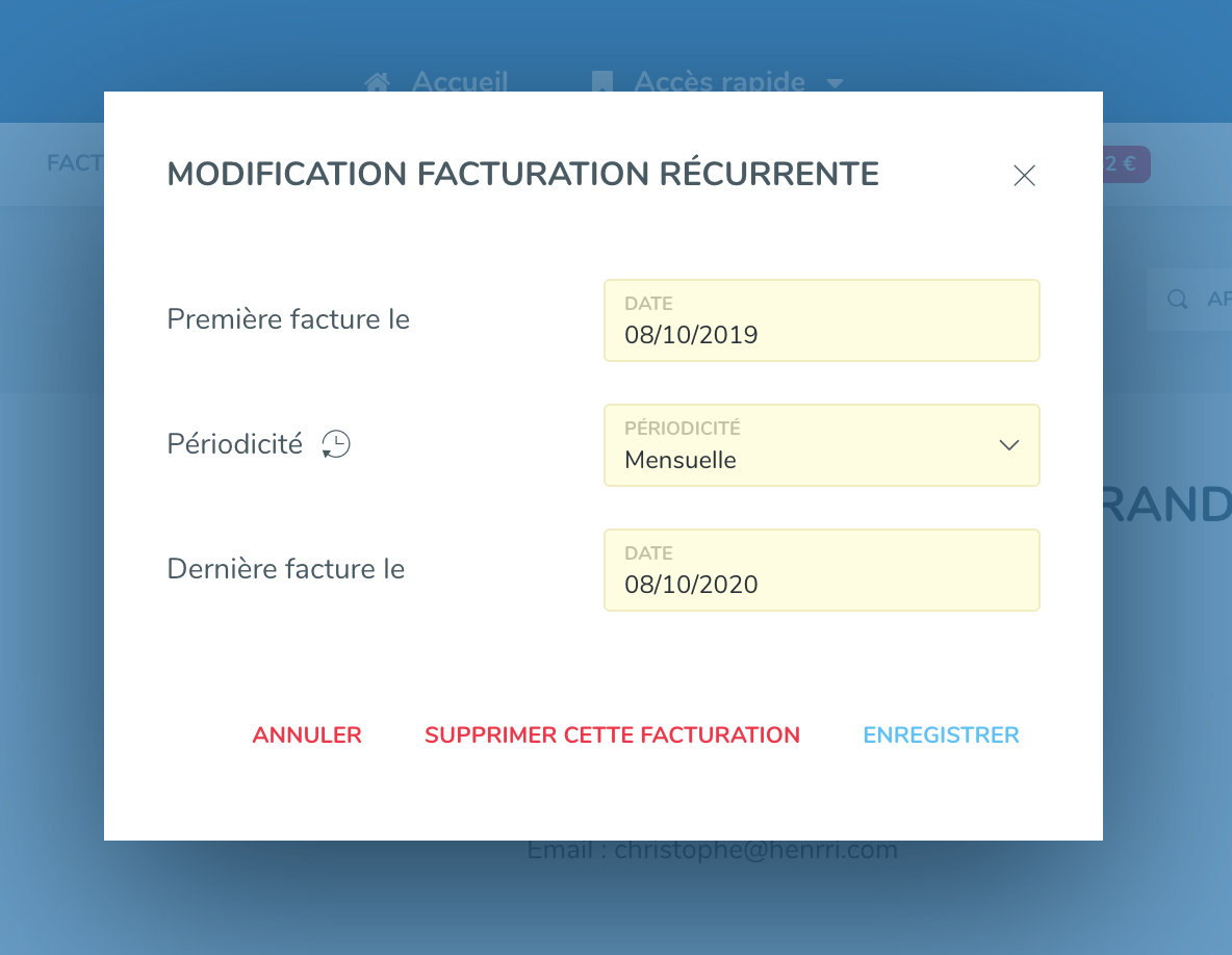 Henrri vous propose un mode simple et sécurisé pour facturer de manière récurrente vos clients. Ce mode est particulièrement apprécié dans le cas d'abonnements, de renouvellements annuels ou de prestations planifiées à l'avance.