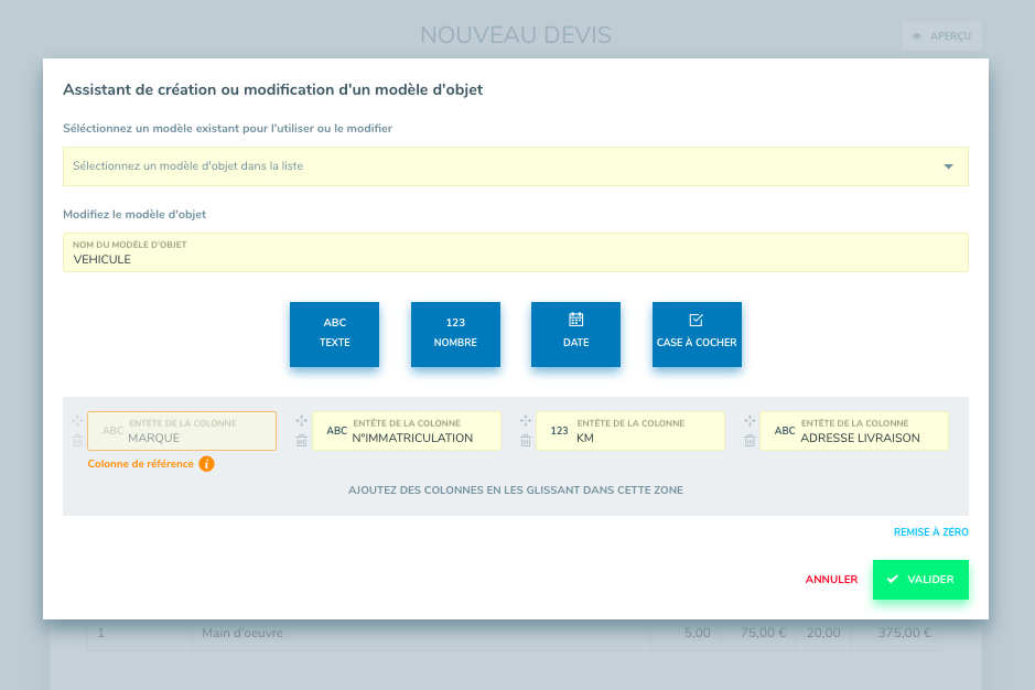 Un objet peut contenir plusieurs variables. Un garagiste peut créer l'objet "Votre véhicule" pour afficher par exemple la marque, le type de véhicule, son immatriculation et le kilométrage. Vous disposerez ainsi d’un suivi des travaux par client et par véhicule.